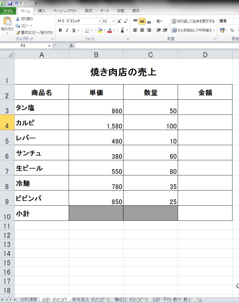 - タン塩の売上金額を計算し、ビビンバの売上金額のセルまでコピーする。