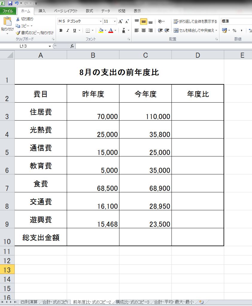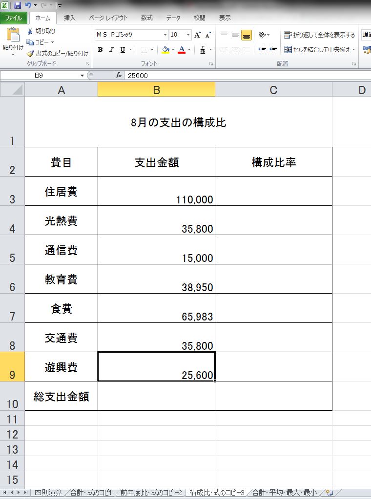 - 総支出金額を求め、各費目の総支出に占めるその費目の支出の割合を求めましょう。ただし、 住居費の構成比のセルに入力した式を遊興費の年度比のセルまでオートフィルして、うまく機能するように、数式を設定すること。