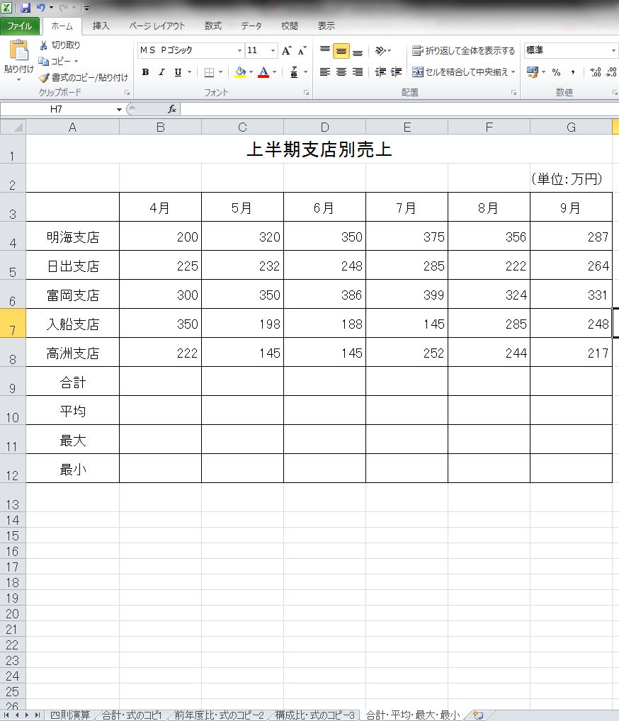 - シート見出しには、 合計・平均・最大・最小 と名前を付けましょう。