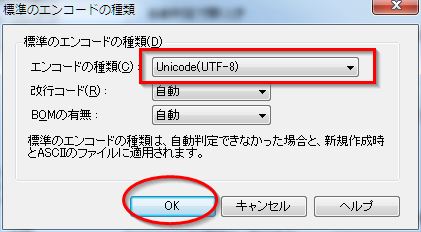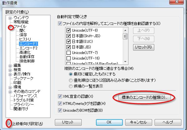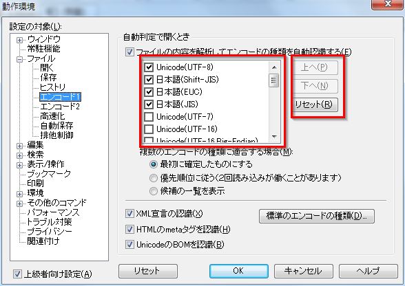- 自動判定で開くときのエンコードの判定の優先順位もUTF-8が上に来るように順序を変えておく
