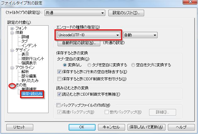 - 設定の対象のその他から保存・読込みを選択し、エンコードの種類の指定をUnicode(UTF-8)とする