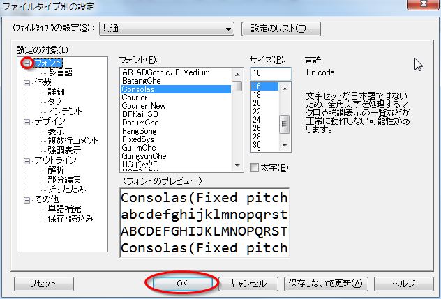- (設定任意) メニューバーの[その他]からファイルタイプ別の設定を選択、設定の対象のフォントから読みやすいフォントとサイズを選択(デフォルトの表示に慣れている場合は、変更しなくてもよい)