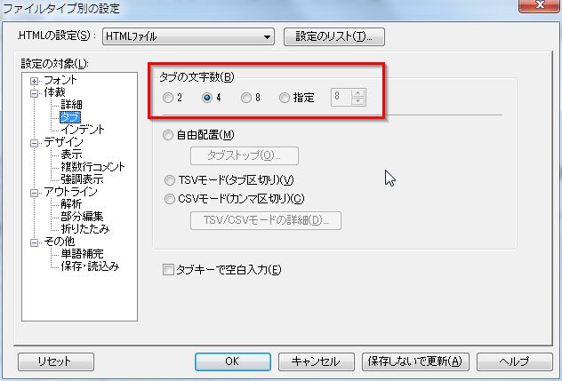 - (設定任意) 設定の対象の体裁→タブで、字下げのタブを何文字分にするか設定できる。